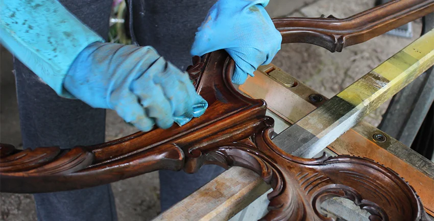 Once in the studio, I disassembled the easel, reducing it to much more manageable sized pieces, making it a lot easier to tackle. The next step was to strip back the old shellac and many years of wax build up, so that I had a clean surface to gild. This involved washing it down with 2 different solvents, 3 pairs of rubber gloves, and a lot of elbow grease!